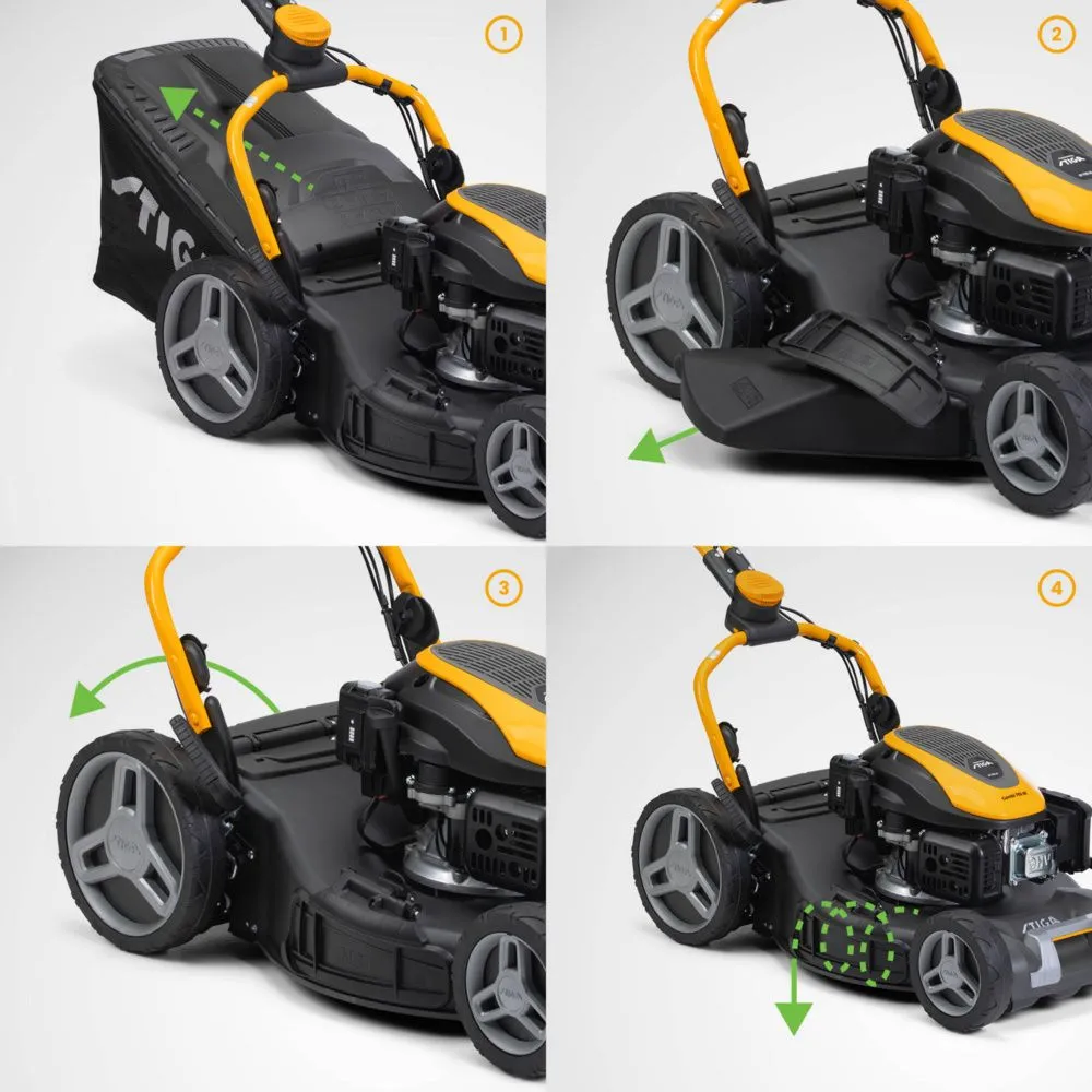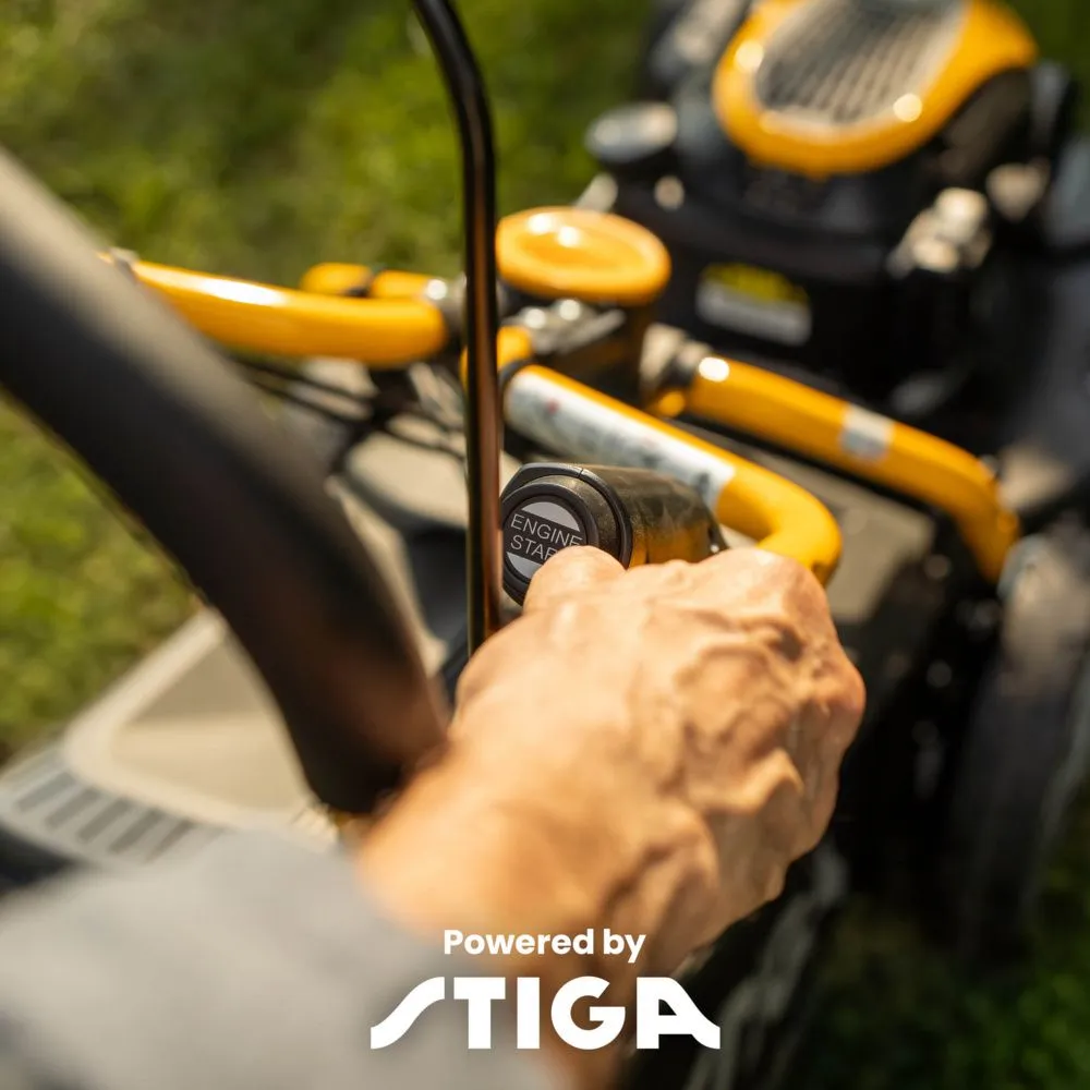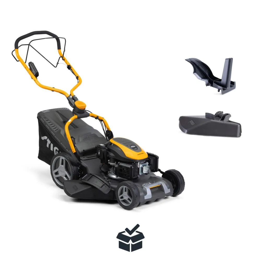 W zestawie znajduje się ładowarka, akumulator rozruchowy, wkładka mulczująca, boczny deflektor